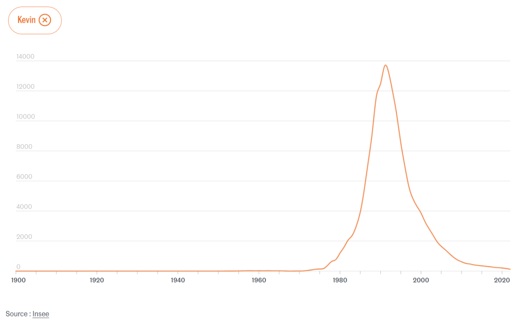 13 282 , c’est le nombre de bébés appelés Kevin par leurs parents en 1991. Un record cette année-là et une moyenne de 36 bébés Kevin par jour. Au total, ce sont près de 70 000 petits Kevin qui sont nés en 5 ans, entre 1989 et 1994. Le prénom le plus donné dans l’hexagone sur cinq années consécutives, toutes régions confondues. Les années 90, l’heure de gloire des Kevin. Un acte presque inconcevable pour les parents d’aujourd’hui. Comme un bâton dans les roues d’une progéniture à venir. Et pourtant un prénom en voie d’extinction.